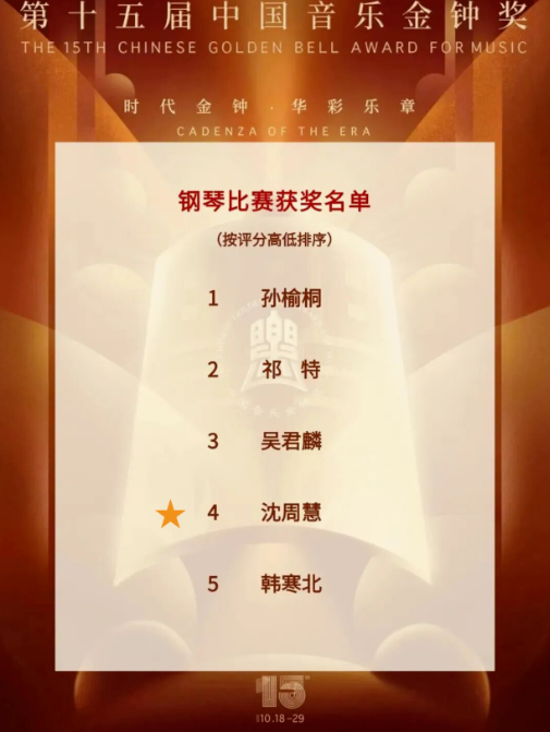 在这一中国音乐界最具权威性与影响力的国家级艺术大奖赛中,由上海音乐家协会共选派24名选手参赛。经过激烈比拼,18名选手凭借扎实的专业素养与出色的舞台表现成功晋级复赛,其中7名选手进一步闯入半决赛。最终,3名选手成功跻身决赛,分别是来自茱莉亚音乐学院的沈周慧(钢琴组)、上海民族乐团的李胜男(民族弹拨乐-琵琶组),以及上海市黄浦区青少年科技活动中心的王轶文(民族弹拨乐-中阮组)。沈周慧在总决赛中表现优异,以第四名的成绩脱颖而出,荣获本届金钟奖(钢琴组)奖项。