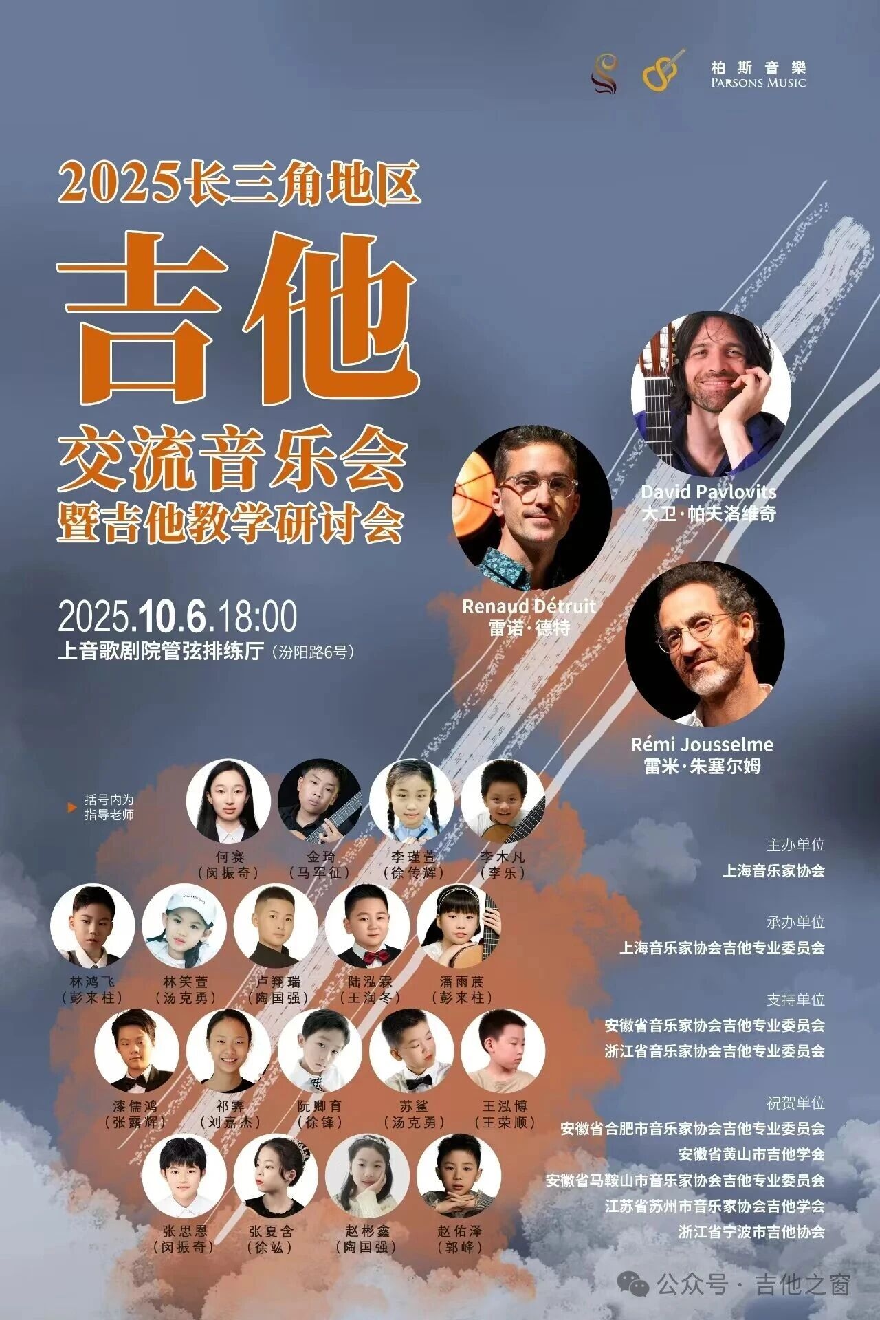 为深化长三角地区吉他音乐交流,推动吉他教育事业创新发展,由上海音乐家协会主办的《2025长三角地区吉他交流音乐会》于10月6日18点在上音歌剧院管弦排演厅顺利举办。音乐会为公益活动,免费向公众开放。来自长三角地区的吉他优秀小学员们表演了精彩节目,三位特邀大师大卫·帕夫洛维奇、雷米·朱塞尔姆、雷诺·德特更是把音乐会气氛推向了高潮。最后由所有演员一起弹奏了吉他大合奏《我和我的祖国》,向国庆献礼。上海音乐家协会副秘书长秦焱、匈牙利驻上海总领事馆总领事罗亚当等领导、嘉宾出席音乐会。