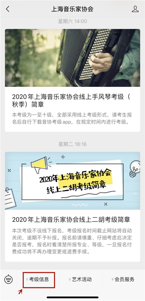 01、进入上海音乐家协会官方微信,点击“考级信息”